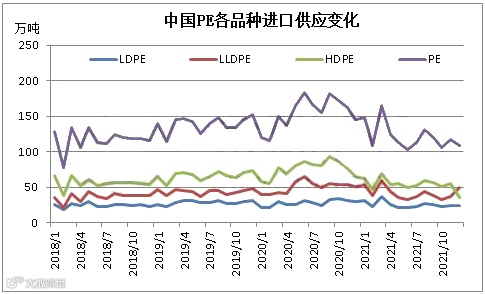 国内产量不断攀升,产品竞争压力加大,中国PE处于全球价格洼地,叠加年内集装箱紧张,海运费大幅攀升等影响,国际PE贸易流向发生变化,其资源销至中国明显减少,2021年全年来看,PE进口量较202