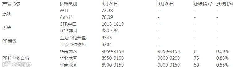 今日提示:昨日石化大区出厂价格上调,支撑现货报盘,临近国庆假期,下游部分企业适当采购,市场成交尚可,整体两油库存快速消耗,今日早库在72万吨。目前来看,成本面支撑仍旧强劲,且部分地区限电,石化及终端制品企业均出现降幅或停产情况,对供需面均有影响。预计今日PP市场延续高位运行。PP拉丝主流在9000-9200元/吨。