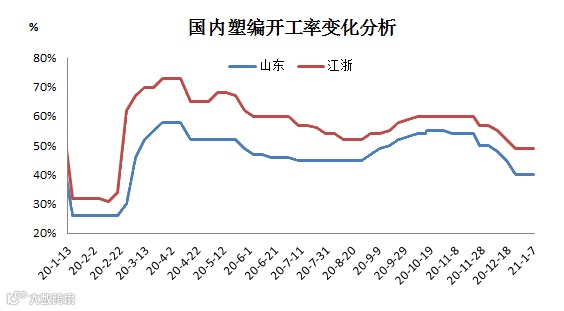 数据显示国内塑编行业平均开工率在44.00%附近,仍在相对低位的水平。据悉北方环保及南方限电政策影响尚存,加之年关趋近且疫情反复严峻部分塑编企业年前复工困难,塑编开工低位现象节前难改,因此采购原料积极性将持续不佳,市场成交放量有限。