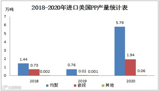 2018-2020年我国进口美国PP总量约10.74万吨,每年进口美国PP量仅占全国进口总量0.15%-1.19%。2020年进口美国PP量共计7.79万吨,其中均聚占进口均聚总量1.29%,嵌段共聚量占进口共聚量1.05%。其他共聚占进口其他共聚总量0.31%。从进口量上可看出国内进口美国货源极少,但美国PP价格飙涨,为国际市场价走高做好铺垫,影响了其他地区货源流入美洲及欧洲市场,侧面带动整个外盘价格趋高。