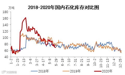 2020年5月份国内检修装置陆续开始,国内装置损失量增加,对供应端压力有所缓解。5月份我国石化库存维持去化,至5月底,国内石化库存较2019年同期低10万吨左右,供应端压力较小。另外,国内两油实施的“百日创收增率”行动,5月份国内石化出厂价格坚挺,成本面支撑加强。