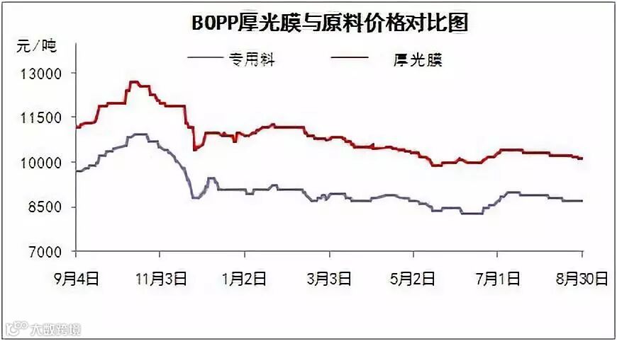 月底两油库存维持在69-76万吨区间,PP期货阴跌表现,加重业者让利出库心态,中油出厂再次下调,成本支撑转疲,BOPP持续下行,截止8月30日,华东地区厚光膜主流价格在9700元/吨。