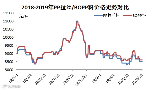 受此影响,2019年BOPP薄膜料价格相对处于高位,BOPP薄膜料出厂价格与拉丝价差维持在50-300元/吨,高于历史同期。