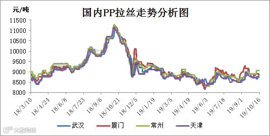 当前十月已过半,前几日因中美经贸的良好切磋促使了原油的上涨,同时也带动了聚丙烯产品上行,但近日来看,原油价格逐步下降,削落了成本支撑。国内PP市场走向弱势,交投气氛清淡。且下游用户的随接随用,使市场陷于观望状态。以下为近期国内聚丙烯市场的走势情况:
