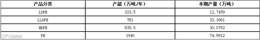 截止目前,我国PE总产能1940万吨/年,因宁夏宝丰二期低压装置正式出产品,因此总产能较上月新增30万吨/年,PE整体产量上月同期增加2.55万吨,其中高压产量增加1.12万吨左右,线性产量增加1万吨左右,低压产量增加0.44万吨左右。