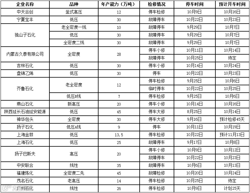 10月国内PE检修装置较上月有所增加,月内神华