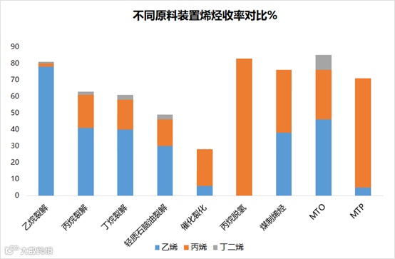 不同的原料和生产工艺,烯烃的产率各有不同。乙烯行业,以乙烷为原料,裂解得乙烯产率最高,可达80%;以甲醇、煤炭为原料,经过MTO路线制得的乙烯和丙烯的产率之和较其它路线高;以石脑油、汽油等为原料裂解生产乙烯的产率并不高,但副产品较为丰富。丙烯行业中,以丙烷为原料,丙烷脱氢产率最高,其次是MTP,同样,经过MTO路线制得的乙烯和丙烯的产率可灵活调整;烯烃原料多元化和创新技术的发展及应用,将进一步提高产品成本竞争力,促进石油化工产业升级。从最终产品来看,MTO符合多元化原料市场发展要求,其产品比例可根据市场调整,具有良好的市场灵活性,长期看与蒸汽裂解可分庭抗礼。