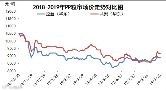 共聚方面与拉丝价格幅度逐渐扩大。从七月下旬开始,共聚价格逐渐走下坡路线,共聚价格与拉丝价格不差上下;但随着金九需求的缓慢启动,刚需逐渐跟进;且宁夏宝丰,延长榆能化均有转产其他产品,部分市场共聚资源短缺,市场竞争压力相对减少,共聚价格重回高位。三季度来看,共聚最高报盘9400元/吨,最低报盘维持8350元/吨,目前共聚主流报价在9050-9250元/吨。