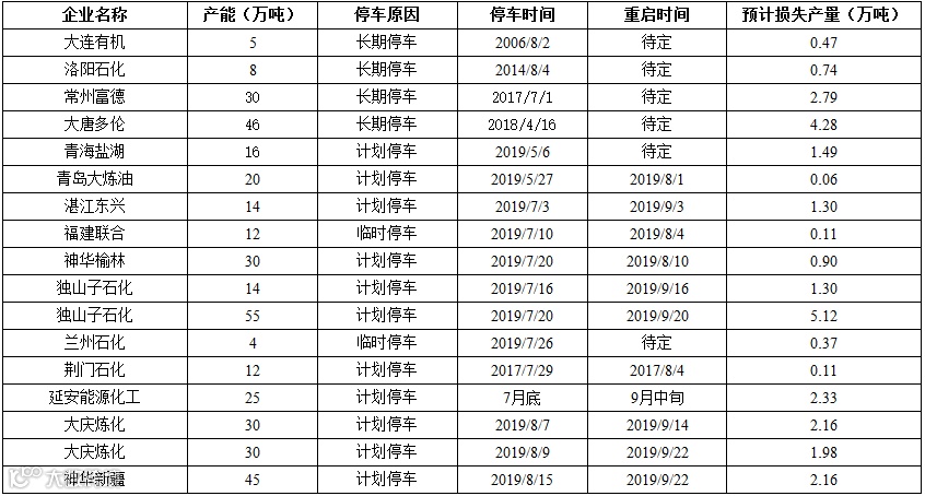 炼化双线8月份按计划检修;