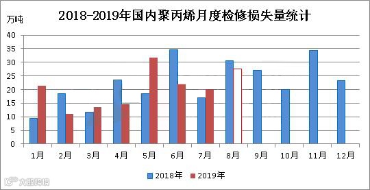 2019年8月份,国内聚丙烯检修损失量预计在27.63万吨,环比(2019年7月份20.12万吨)增加7.51万吨,增幅在37.33%;