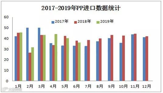 由进口数据发现,自5月份以来进口量呈现逐步缩减趋势,主因国内经济增速放缓,同时国内下游工厂受环保及订单拖累,导致市场成交量萎缩。而进口势必跟国内需求密不可分得。2019年以来,美元兑人民币汇率呈现逐步攀升局势,国内进口货源成本势必被动抬升,加重进口货源成本压力,在国内进口PP产品价格竞争优势将削减,这也是近期国内做美金商家苦恼来源。