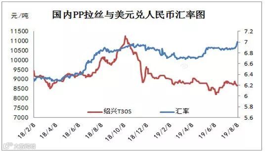由上图可发现国内PP拉丝与美元兑人民币汇率自2018年底两者反向发展趋势愈发明显,且在2019年两者反向发展趋势更明显。8月1日至今美元兑人民币汇率七日连涨,也就是人民币兑美元中间价连跌七日,人民币贬值,短期国内PP市场影响力度有限,国内PP市场价格近期偏弱下行,主要还是期货连跌及国内经济疲软,终端需求跟进乏力所拖累。