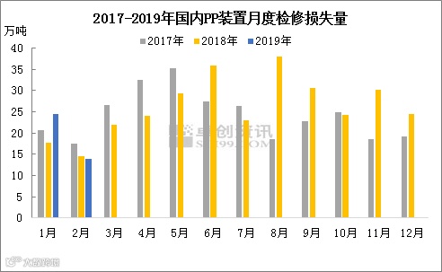 2019 年来看,无论是国内还是国外,聚烯烃都处在产能投放的大背景中,据卓创统计,2019年全年预计投产聚丙烯产能总量在450万吨附近,国外投产产能总量大致在385万吨,目前确定开始生产的已经成功了大约90万吨。而根据年初公布的装置检修计划来看, 2019 年是检修小年,整体检修损失量低于去年(临时停车的暂时无法统计)。 国内供应预期将处于高位。