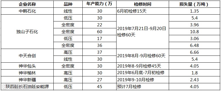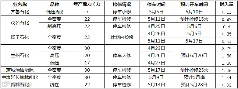 5月份国内聚乙烯检修较前期有所有增加,共涉及产能245万吨,聚乙烯损失量约为12.1万吨。其中线性损失量最高在6.75万吨,低压损失量在2.66万吨,低压损失量在3.13万吨。5月份兰州石化PE装置全月大修,除此之外,茂名石化全密度装置、延长榆能化全密度装置、吉林石化线性装置、蒲城清洁能源全密度装置检修时间较长,目前暂未重启,其他装置检修时间较短,目前已正常开车。