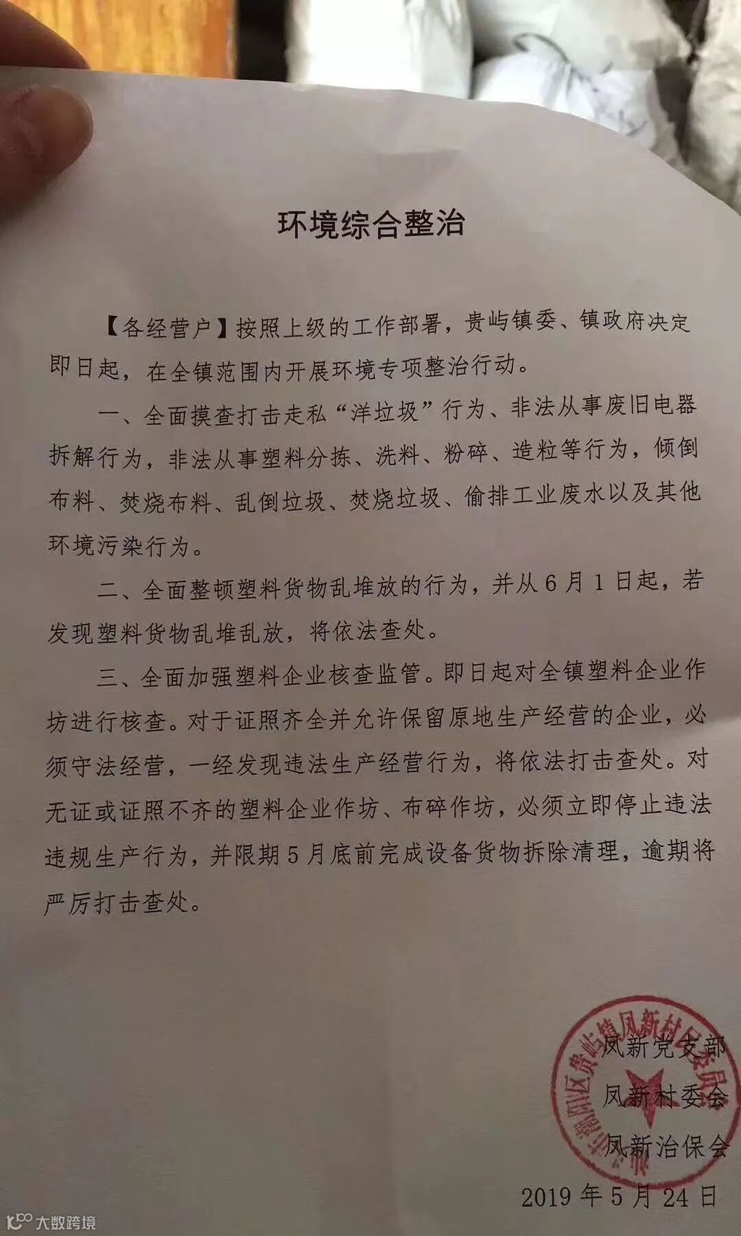 凤壶村委会:无证经营废塑料企业一律停止加工,并自行将加工设备拆除、断电,5月27日起将地毯式登记,拒不配合的经营者将移送公安机关。