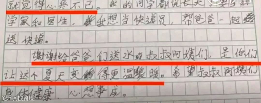 “谢谢给爸爸们送水的叔叔阿姨们,