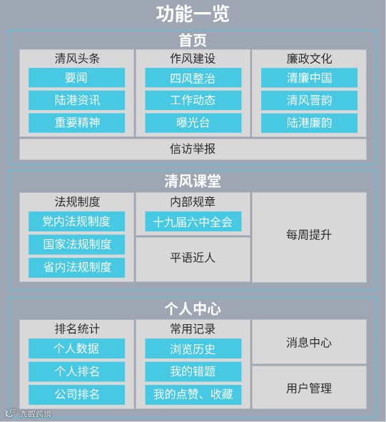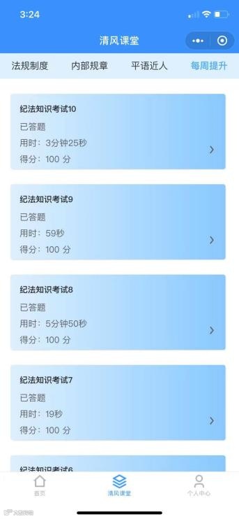 清风课堂中的法规制度、内部规章、平语近人三个部分,主要提供了党纪国法、公司廉政制度、平语近人等多角度内容的学习,每周提升为每周测验的功能。