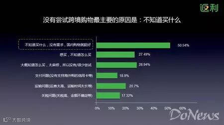 其中,“不知道买什么”占比50.54%、“不知道怎么买”占比27.49、“太麻烦”占比28.94、“没有支付迟海外购的信用卡等”占比18.9、物流问题占比20.7、关税问题占比17.32。