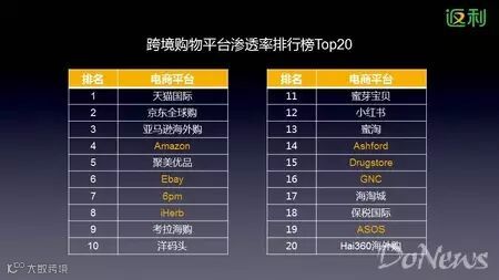 此外,返利网还发布了跨境购物平台渗透率TOP 20。其中,天猫国际、京东全球购、亚马逊海外购、Amazon、聚美优品分别位列前五。