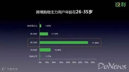 在返利网参与调研的用户中,超过4成的用户有过跨境购物经验。根据报告,当前跨境购物主力用户年龄层主要集中在26-35岁,占比71%;18岁以下用户占比1.17%;19-25岁用户占比15.09%;36-45岁用户占比11.12%;46岁及以上用户仅占比1.62%。