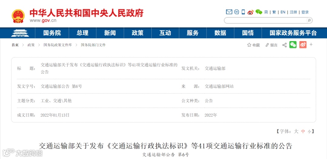 日前,《交通运输部关于发布〈交通运输行政执法标识〉等41项交通运输行业标准的公告》正式发布。具体内容如下: