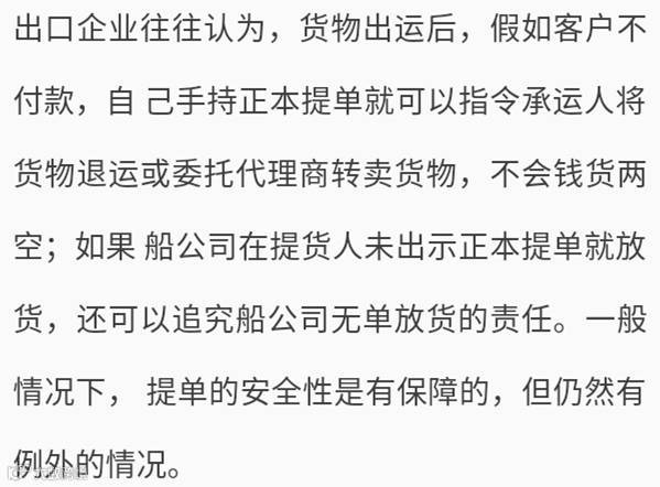 2010 年,四川某出口企业 A 与美国进口商 B 签订了一批服装产品出口合同,金额 20 万美 元,支付方式为 LC 30 天。进口商开出信用证,信用证要求指定进口商为收货人,并指定 美国某公司为承运人。出口商及时安排出运并向银行交单,但货款迟迟未到账,此时银行提 出不符点,并退回单据。出口商急忙查询货物下落,被告知货物已经被提走。出口商 A 要 求船公司解释为何三份正本提单仍在银行,也并无放货指令,凭什么放货 ?船公司告知,根 据美国法律,记名提单可不凭正本提单,仅凭收货人的身份证明即可放货,船公司无责任。 出口商 A 面临着手持正本提单却货、款两空的残酷现实。在要求船公司赔偿货物无果的情 况下,一纸诉状把船公司推上了被告席。最终此案判定适用于美国 1936 年海上运输法,而 按此法规定记名提单项下承运人可以不凭正本提单放货,只要收货人提供了证明自己合法身 份的有关文件即可,最终判决船公司不承担责任。