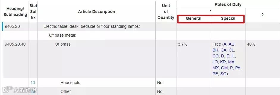 继续我们在上一步对HTS码的查询,针对具体产品,可以看到在“Rates of Duty”处有好几栏,究竟应该看哪一栏呢?
