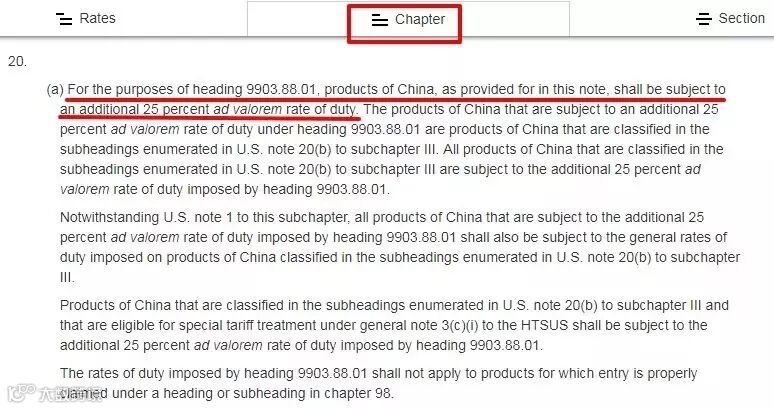 这句话中提及“note 20”是个什么东西呢?在“Chapter”页面下我找到了这个note 20,它是对中国产品加税的一个解释。这里明确说明了,25%是额外征收的税率。下文中也继续列出了归在“9903.88.01”项下的编码。