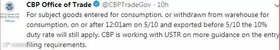 根据美国海关与边境管理局(CBP)的通知,只要在5月10日前从中国出口、6月1日前到港,仍可按照10%税率征收。具体的操作指导请见下图,可以将这张图发给正在等待收货的美国客人,请他们密切关注操作细节。