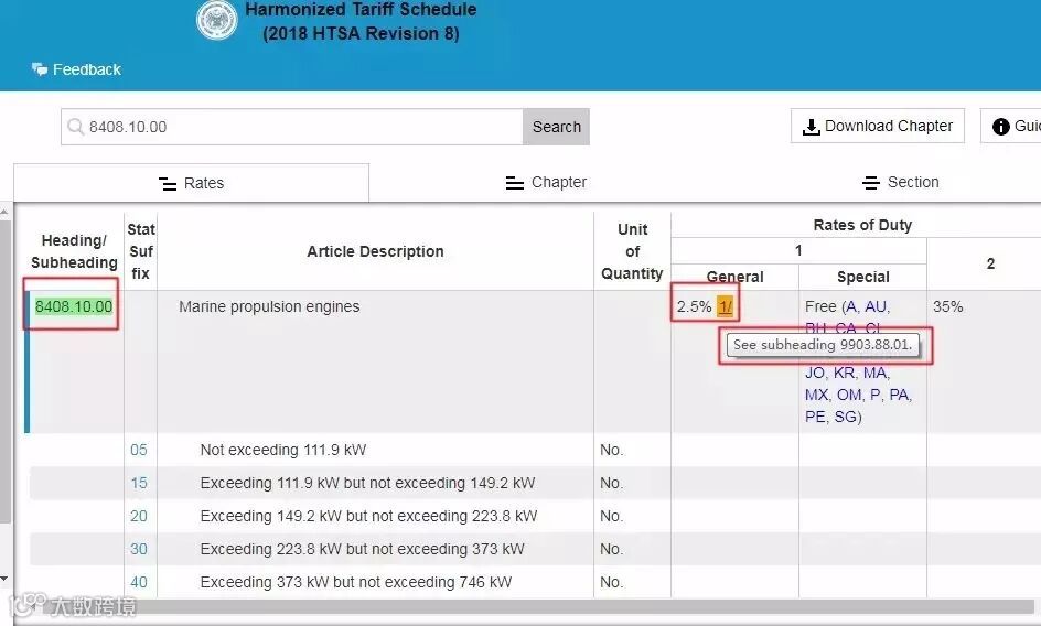 我们以在美国加征范围的税号“8408.10.00船用推进发动机”为例演示,这项产品被列入了第一批340亿美元的加税清单中,此前它的进口税率在“General”处显示是2.5%。但它后面现在跟着一个“1”,显示让我们再去查看“9903.88.01”这个副标题。
