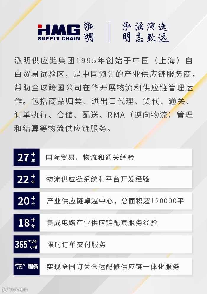 泓明供应链集团于1995年创始于中国(上海)自由贸易试验区,深耕中国集成电路产业供应链20余年,是中国数智化产业供应链服务引领者。集团总部位于张江科学城,在全国17个城市建立了31个产业供应链物流中心。