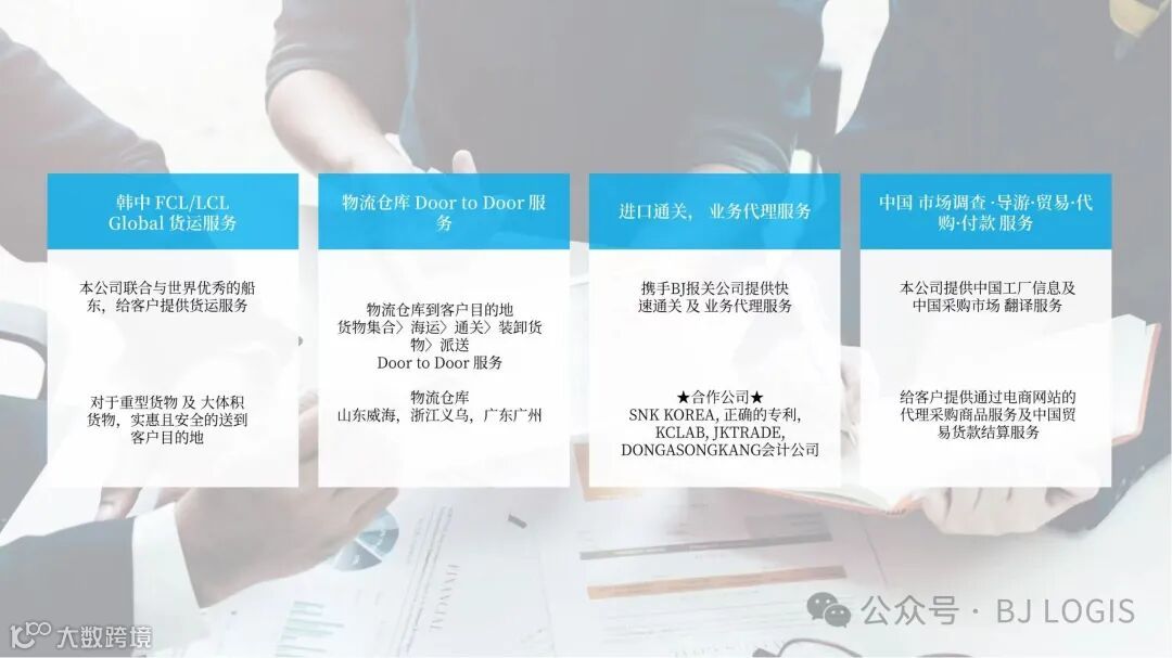 基于在物流运输的优势,我们积累了大量的忠实用户和口碑。目前网站活跃采购会员数量达3000+。为了 能够更好的服务客户,提供超性价比的产品和更多元化的服务,我们在韩国本土创建了BJ商城展示平台,届时也向中国国内优秀、有实力的工厂商发出邀请,免费入驻BJLOGIS商城平台,为韩国客户提供质优价廉高品质的商品,同时也加速促进工厂商的入韩市场渠道和销量的提升,获得韩国市场的地位和口碑。