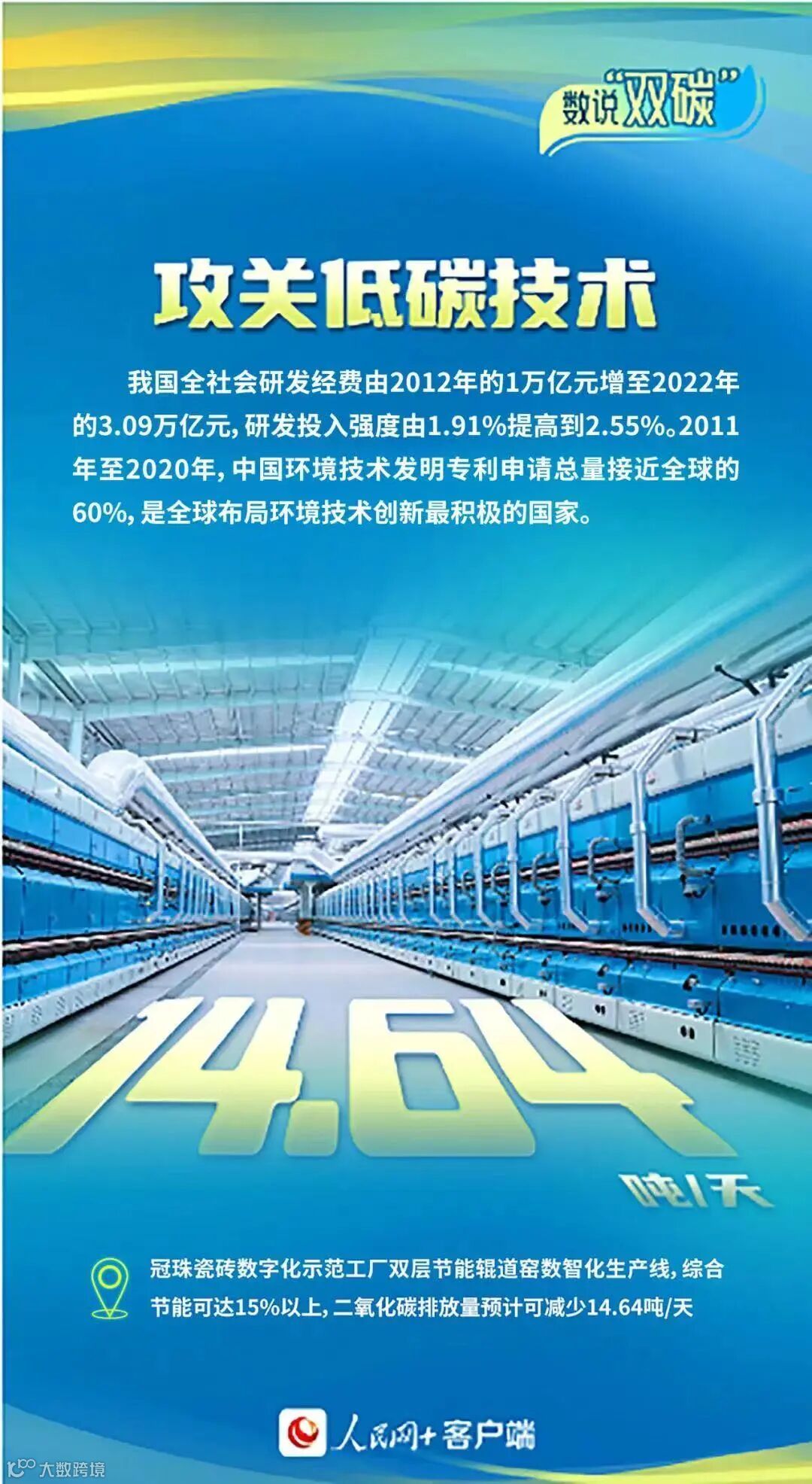 近期,人民网“双碳论坛”发布了#12组数据看中国绿色发展#话题,不同领域在“双碳”道路取得的优秀成绩如中国首条零碳公路、低碳建筑,冠珠瓷砖低碳技术等,深刻记录在“双碳”目标指引下我国绿色发展的生动实践。生态环境是关系到国家民族永续发展的根本大计,在党的指引和带领下,我国各行各业铆足干劲积极创新,加快节能降碳先进技术研发和应用,践行环保为中国持续增绿贡献力量。