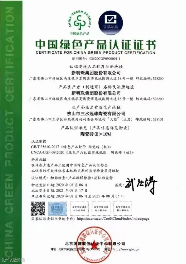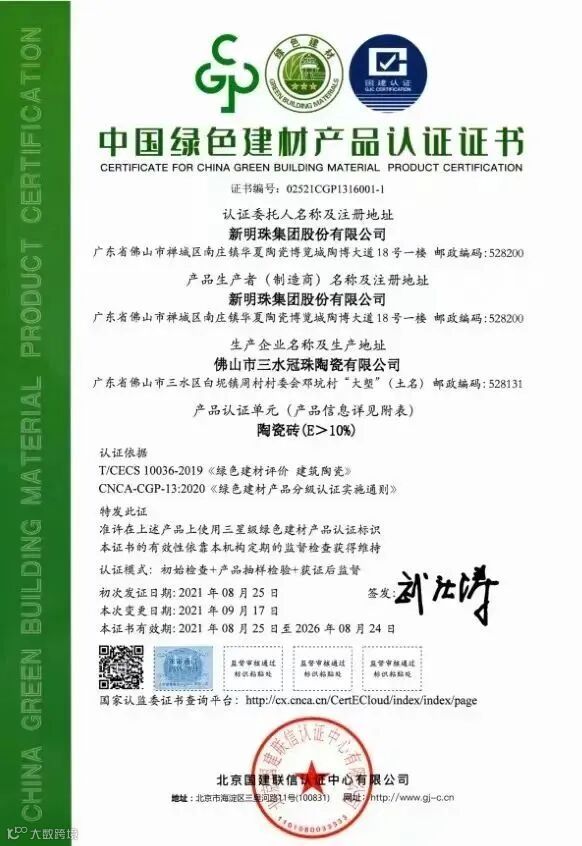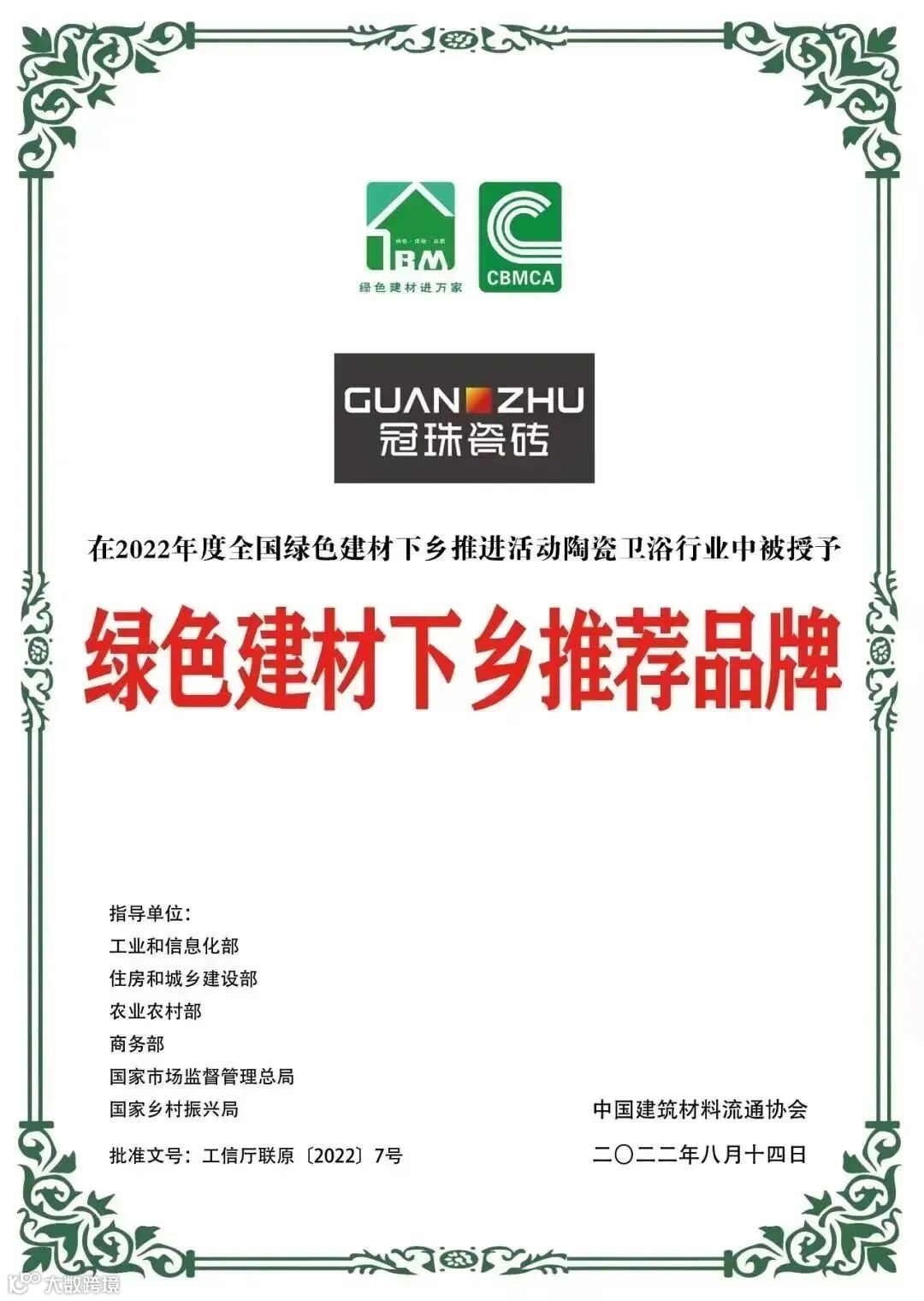 作为陶瓷企业民族品牌,冠珠瓷砖始终坚持立足国家绿色低碳发展理念,不断以科技力和数字化自我革新,走出了陶瓷生产绿色低碳的范本之路,打造绿色建材、绿色健康的美好人居。冠珠瓷砖品牌产品被授予“中国绿色产品认证”证书、入选“绿色建材下乡陶瓷卫浴推荐品牌及服务商”指导目录、实力上榜“绿色建材下乡推荐品牌”,引领中国建陶行业绿色低碳高速发展。