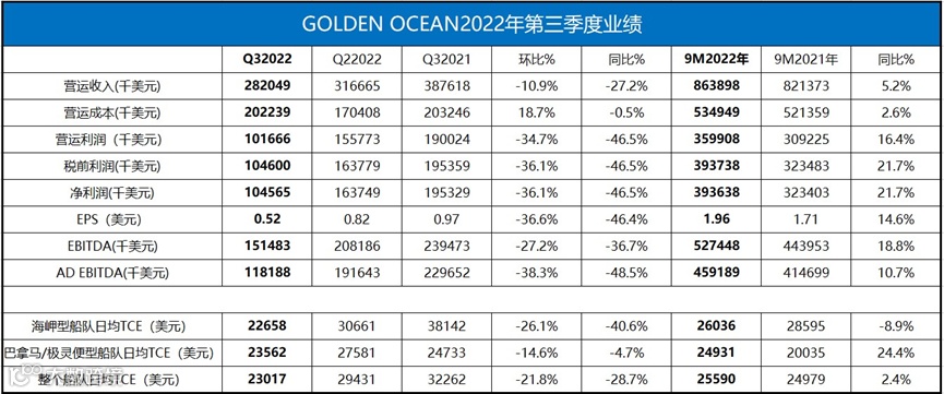 今年三季度,Golden Ocean实现营业收入2.82亿美元,环比下降10.9%,同比下降27.2%;营业利润达到1.02亿美元,环比下降34.7%,同比下降46.5%;税前利润为1.05美元,环比下降36.1%,同比下降46.5%;调整后的息税折旧摊销前利润为1.18亿美元,环比下降38.3%,同比下降48.5%;净利润为1.04亿美元,环比下降36.1%,同比下降46.5%。