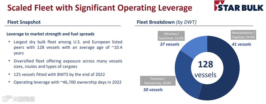 截止到目前,Star Bulk拥有128艘干散货船,1410万载重吨,包括17艘纽卡斯尔型散货船、24艘海岬型船、50艘巴拿马/卡尔萨姆型船、20艘极灵便型船和17艘超灵便型船。