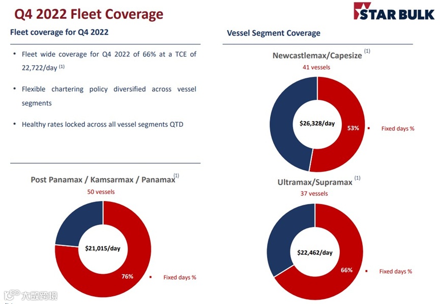 对于今年第四季度,Golden Ocean已经以日平均租金23100美元锁定了约75%的海岬型船队营运日收入,以日平均租金19100美元锁定了78%的巴拿马型/极灵便型船队营运日收入。对于2023年第一季度,则以日平均租金21300美元锁定了约4%的海岬型船队营运日收入,以日平均租金21150美元锁定了21%的巴拿马型/极灵便型船队营运日收入。