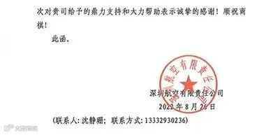 航空的感谢函。深圳航空公司对经发公司在深航舒适经济舱产品的渠道推广、联合宣传等方面的大力支持表示感谢。