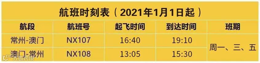 目前常州—澳门每周执行三班,从2021年1月起,航班时刻将继续优化,敬请广大旅客关注航班时刻,合理安排出行时间。
