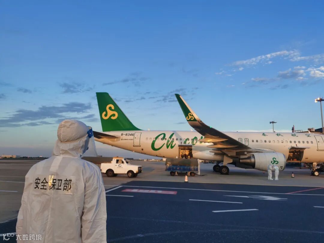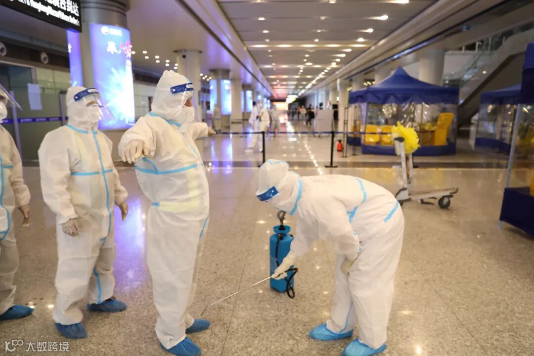 机场医疗救护中心的医护人员正在进行消毒工作,他们是机场疫情防控的第一线:设立分区消毒棚、日常测温、处理废弃防护用品、应对各类特殊情况,他们身着防护服,白天奋战在防疫现场,航班结束后还要加班加点整理数据,每次任务结束时,防护服里满满都是汗水。