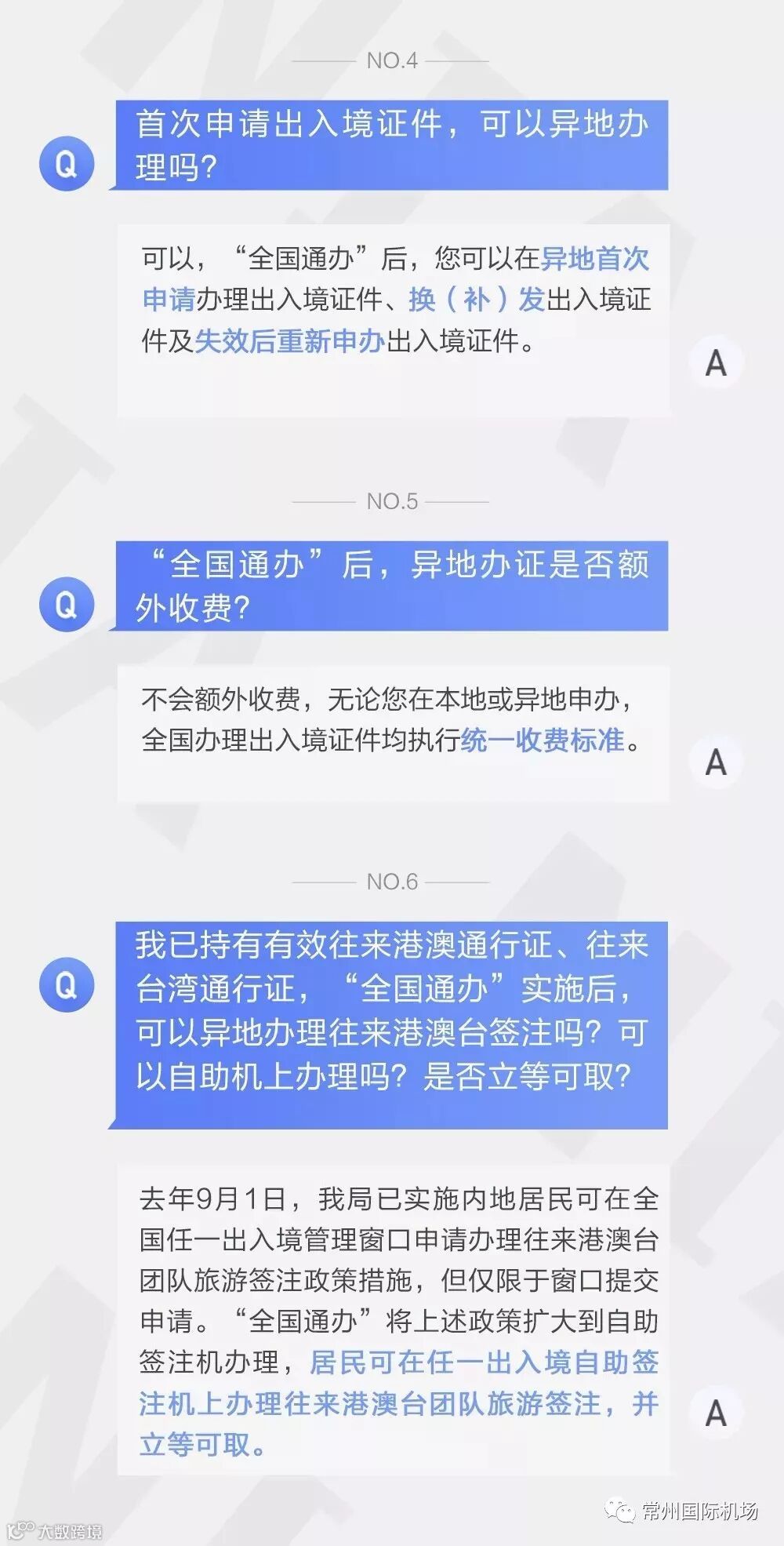 2019年4月1日起,中华人民共和国普通护照、往来港澳通行证、往来台湾通行证等出入境证件实行“全国通办”,即内地居民可在全国任一出入境管理窗口申请办理上述出入境证件,申办手续与户籍地一致。
