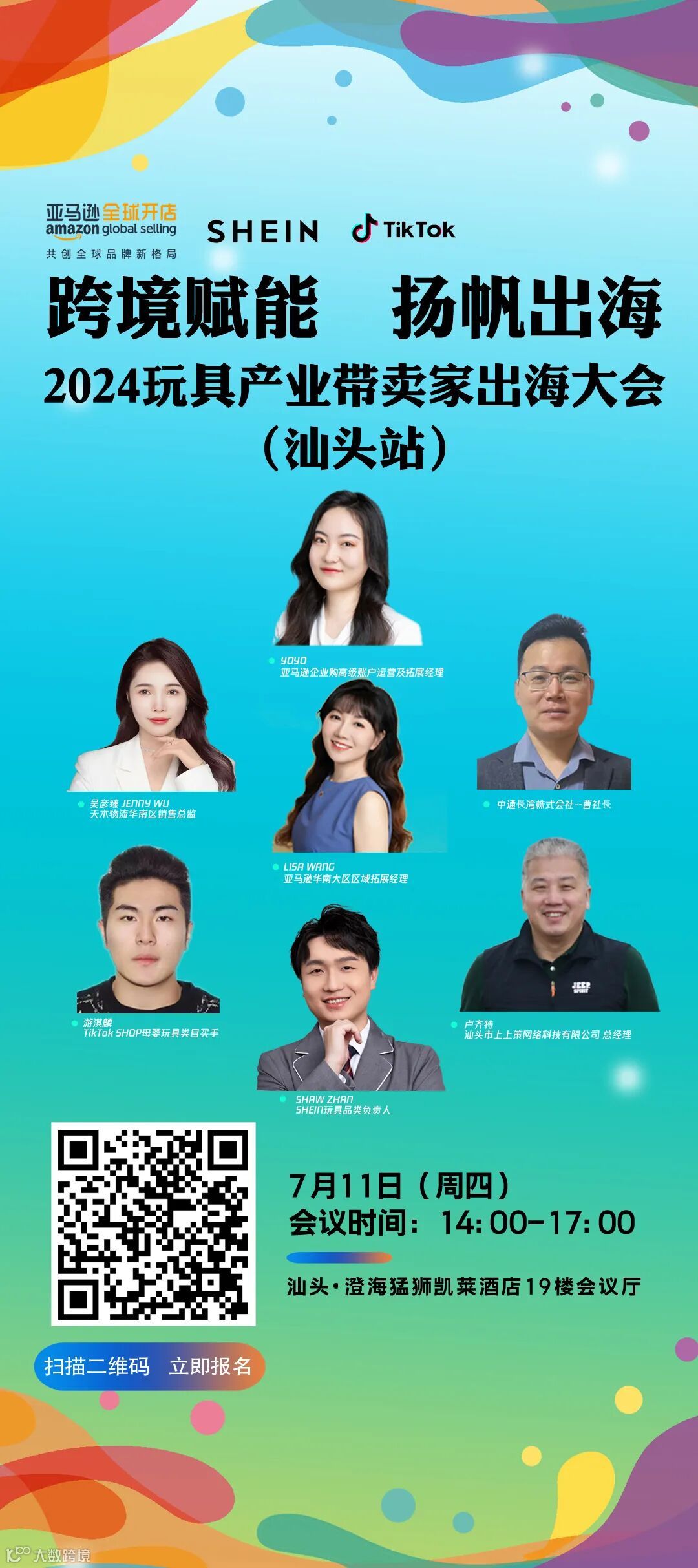 2024玩具产业带卖家出海大会(汕头站)将于7月11日14:30于澄海猛狮凯莱酒店19楼会议厅举行。本场大会由中通長湾和天木国际联合主办,澄海电子商务产业协会、港湾跨境、宝奥城和汇丰银行协办,玩具圈、玩友会承办,联合亚马逊全球开店、SHEIN、TikTok共同举办。