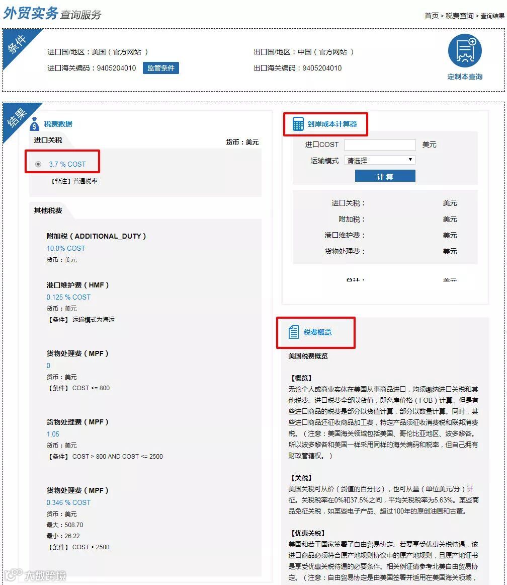 查询结果非常详尽,除了有到岸成本计算器,还会对当地的税费做一个知识科普,非常实用。
