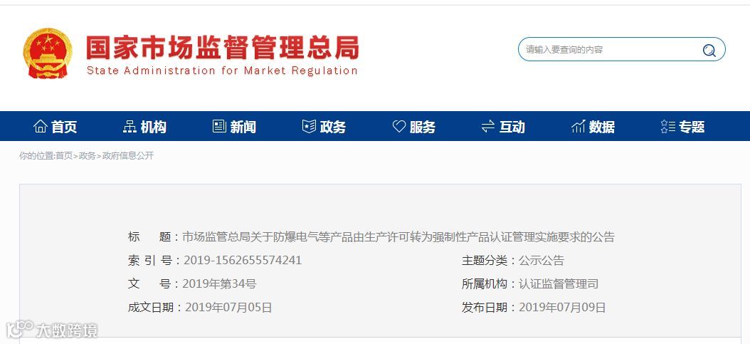 7月9日,市场监管总局发布关于防爆电气等产品由生产许可转为强制性产品认证管理实施要求的公告,公告指出: