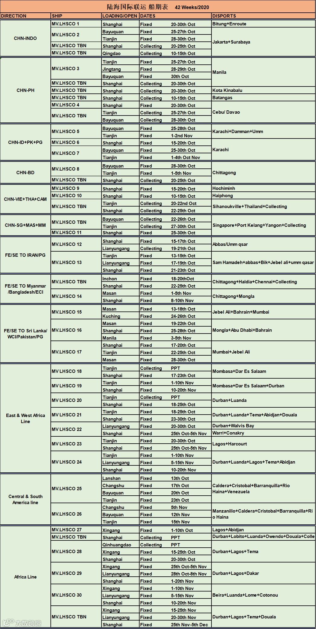 船舶动态 Fresh Tonnage Itinerary 2020-10-13 陆海国际联运