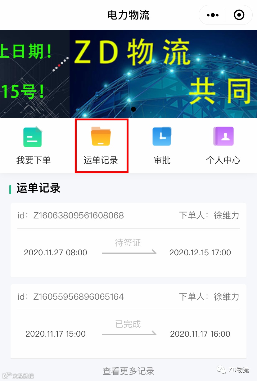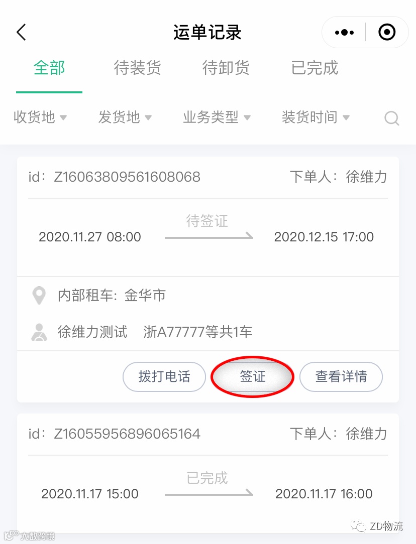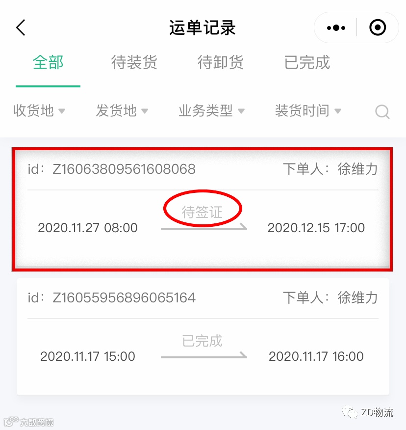 点击上方按键,刷新后运单记录。可以看到运单状态已由“待签证”变为“已完成”。