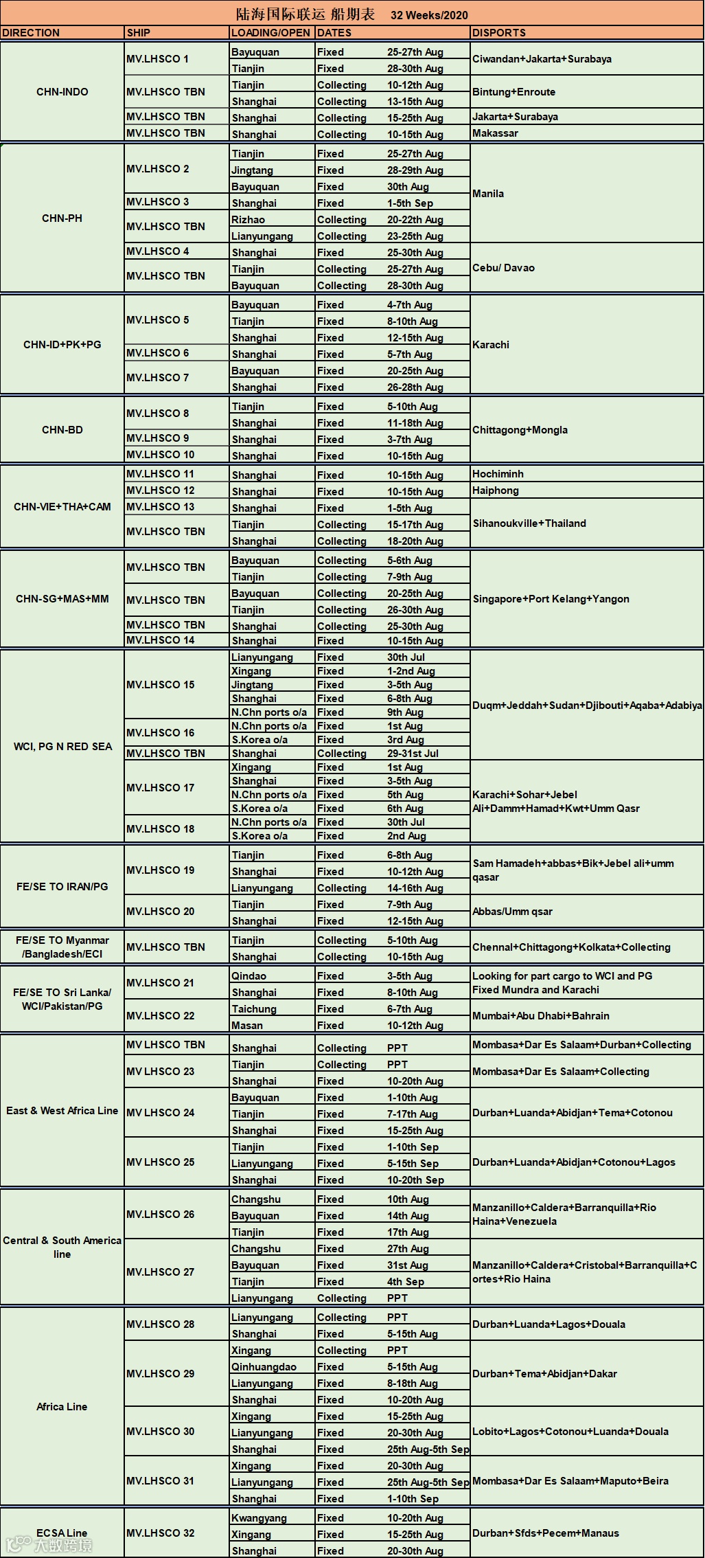 船舶动态 Fresh Tonnage Itinerary 2020-8-10 陆海国际联运