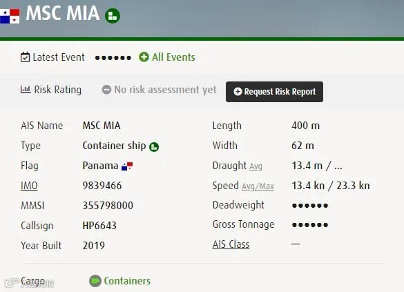 “MSC MIA”轮建造于2019年,最大载箱量为23756TEU,船长400米,船宽62米,挂巴拿马旗,由地中海航运运营,是地中海航运订造的一系列23000TEU级超大型船舶的一员。