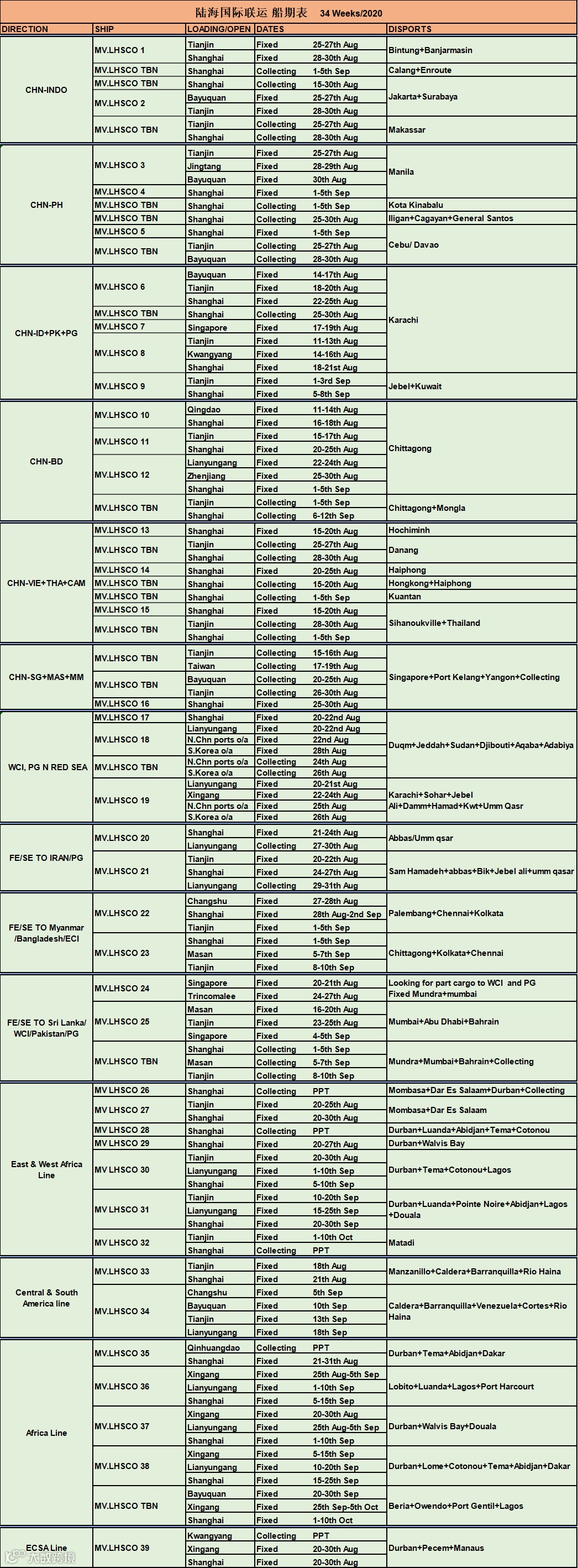 船舶动态 Fresh Tonnage Itinerary 2020-8-19 陆海国际联运
