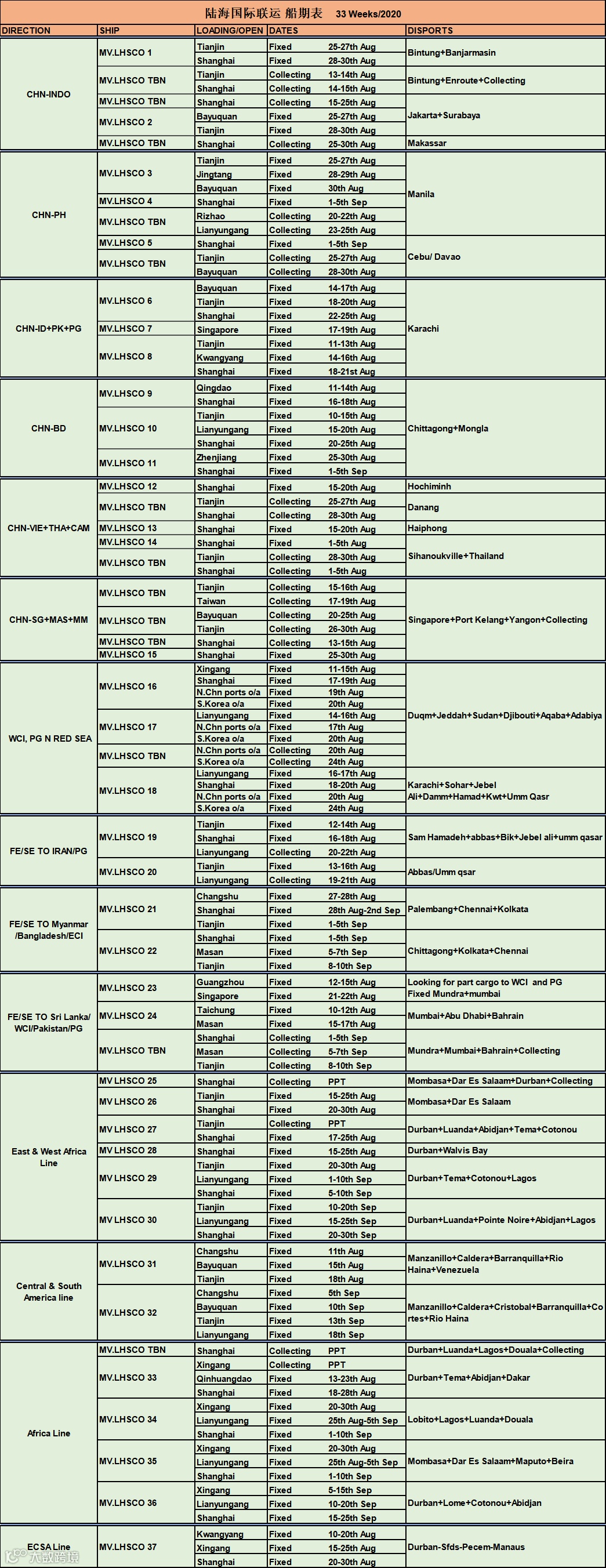 船舶动态 Fresh Tonnage Itinerary 2020-8-12 陆海国际联运